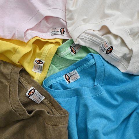 生地は、18/-オープンエンド糸で編みたてられたミディアムウエイト6oz丸胴。綿100%の天然素材は、着心地と経年変化の楽しめる素材です。オープンエンドの生地感は、ざっくりした風合いが特徴です。たっぷり目のサイズ、ボックスシルエット、褪せてかすれたカラーリングは、ザ・アメリカンベーシックと言えるでしょう。通年で使いやすくおすすめな一着となっております。