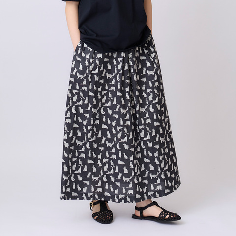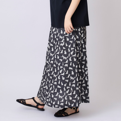 シンプルなブラックトップスが、スカートのやわらかな柄を引き立てるバランスのよいコーディネートです。