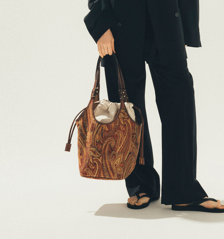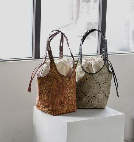 カジュアルなスタイリングにもキレイなスタイルにも合わせられるヴィンテージファブリックのような新鮮な柄。織りによって浮き出した模様が素敵で、プリントでは出せない趣があります。持つだけで存在感を放ち、シーズンを問わず活躍します。