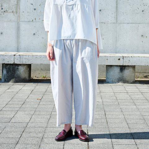 空気をまとうような軽やかさと、涼しげなストライプ。ゆるやかな丸みのシルエットが、抜け感のある大人のバランスをつくります。気負わず着られて、自然と雰囲気が出る一本です。