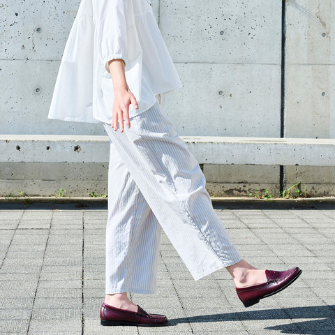 さらりとした肌離れの良い薄手ダンガリーに、ほんのりムラ感のある表情が魅力。軽くて風を通す心地よさと、やさしいストライプが涼しげな印象に。色違いで揃えたくなる、この夏の頼れる一本です。