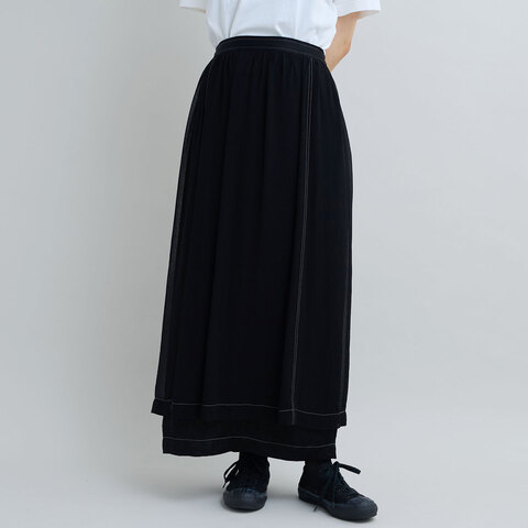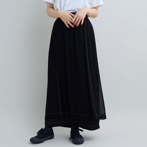 肌当たりが滑らかで心地良いキュプラ100%の素材にキュプラジョーゼット素材の透ける素材をドッキングしたIラインのロングスカート。