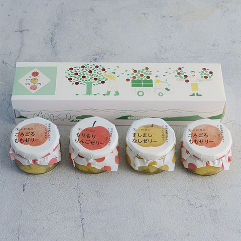 ごろごろももゼリー×2個、ましましなしゼリー×1個、もりもりりんごゼリー×1個の計4個セットです。