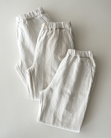生成りと白のストライプで仕上げたリラックス感と品の良さを両立した一本。