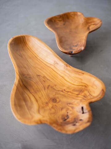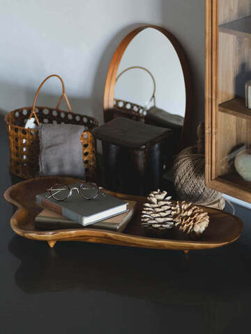 無垢チークの一枚板から仕立てたディスプレイボウル。自然の形状を生かしたワイルドなフォルムが特徴です。サイズはS(W40cm)/ L(W60cm)の2sizeをご用意。華美な装飾を省いたシンプルで落ち着いた風合いはナチュラルスタイルやヴィンテージインテリアとも相性抜群。脚付きで少し浮かせているので抜け感が生まれすっきりとした佇まいに。置くだけで絵になるような存在感はアートピースとして空間に取り入れても◎