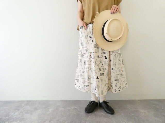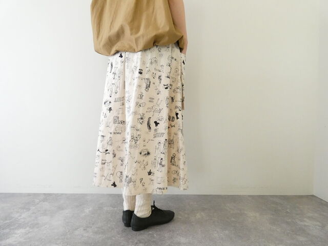 手描きのようなタッチで描かれたモチーフが印象的なスカート。人物や動物、ロゴなどが散りばめられたデザインは、一枚で雰囲気をつくってくれる存在感があります。