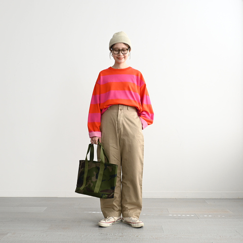 新型のワイドボーダーロングTeeです。程よい肉厚に編み立てたオリジナルワイドボーダーを使用。コットン100%で通年着用しやすいアイテムです。ニット素材ですが、洗濯機で丸洗い可能で取り扱い楽ちんです。