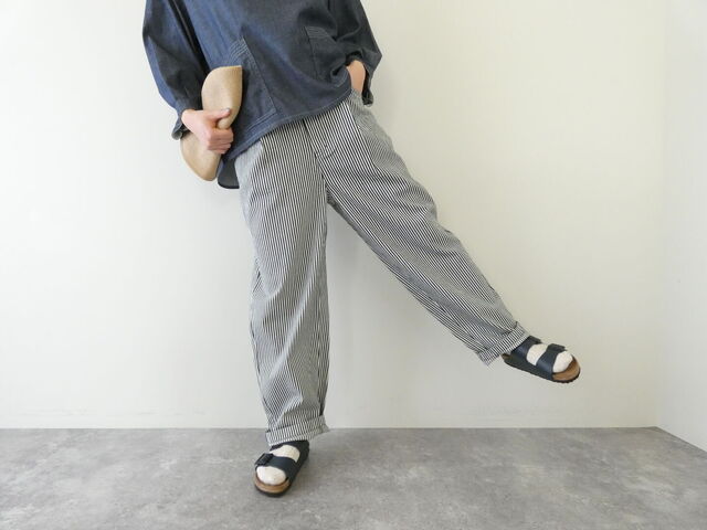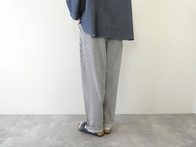 やわらかな風合いのヒッコリーデニムで仕立てた、存在感のあるバレルパンツ。