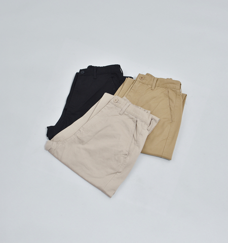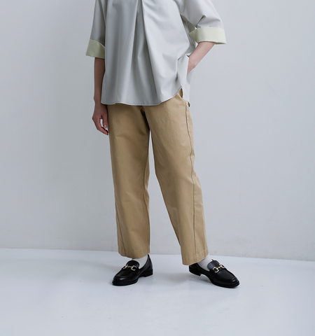 程よい肉感のコットンチノ素材を使用。しっかりとしたハリがありながらも、やわらかな風合いで穿き心地の良さも兼ね備えています。シーズンを問わず、長く愛用いただける素材感です。