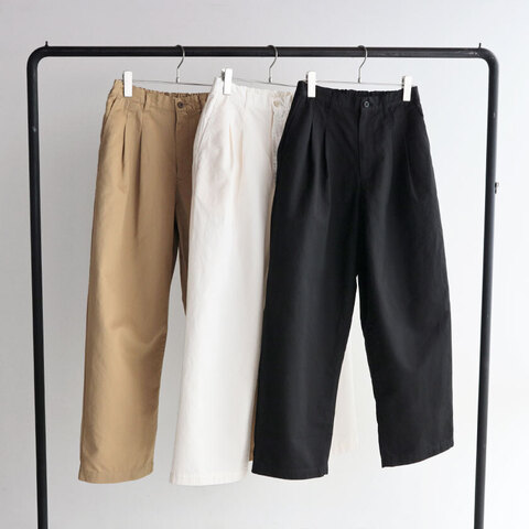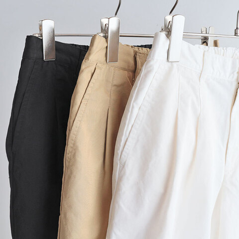 形はリラックス感のあるワイドシルエット。ゆるやかに丸みを帯びたヒップラインが絶妙で、ゆったりとしながらも、フロントに入ったタックとほんのりかかったテーパードがスッキリとした印象を与えてくれます。ウエストは後ろのみゴム仕様で、ポケットは両サイドに1つずつとヒップにも2つ付いているのが嬉しいですね。
