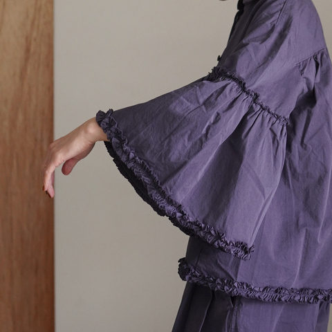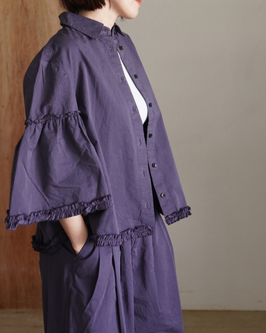 フリルディテールはあえて断ち切り仕様にすることで、甘さを程よく抑え、日常に取り入れやすい表情へと昇華。さらに、製品染めを施すことで生まれる独特のシワ感や色の濃淡が、奥行きあるヴィンテージライクな雰囲気を演出します。