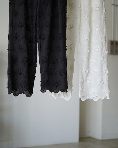 余裕を感じさせる透け感と、繊細かつ存在感のある立体刺繍が印象的なイージーパンツ。