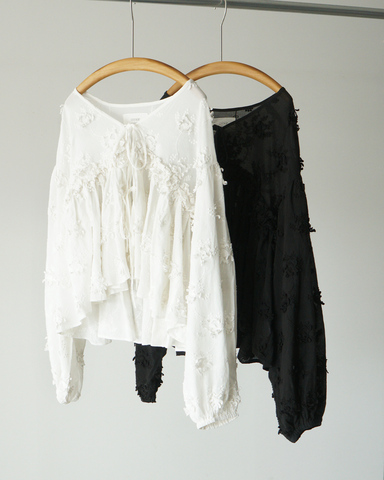 春夏の装いにエアリーさと奥行きをもたらす一枚。繊細で立体的なフラワー刺繍を全面に施したテキスタイルは、シンプルなスタイリングにも豊かな表情を加えてくれます。