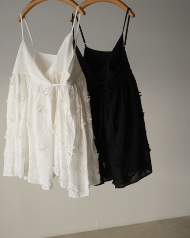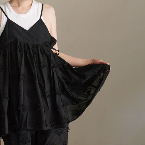 空気を含むような立体感と、動くたびに表情を変える華やかさが魅力のキャミソール。繊細な刺繍で描かれたフラワーモチーフが、装いに奥行きをプラスします。