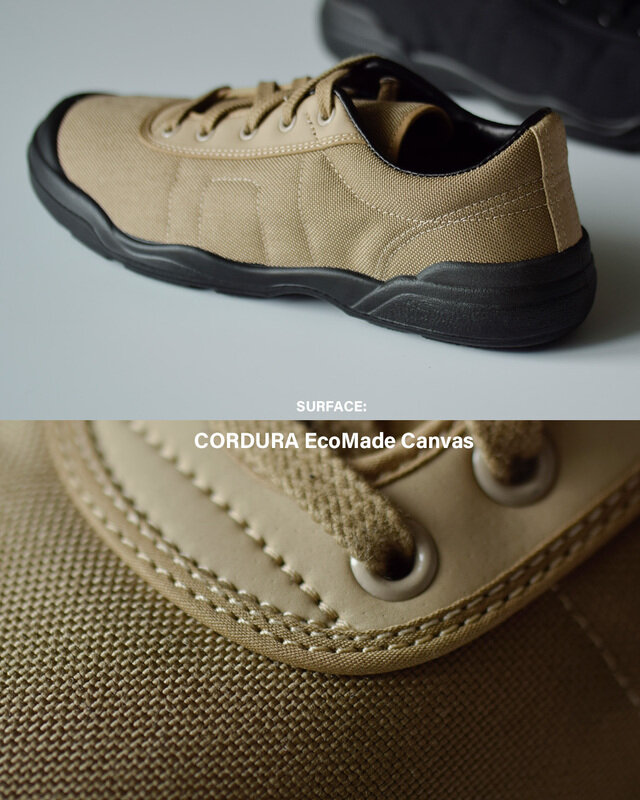 アッパーには、耐久性に優れた「CORDURA EcoMade Canvas」を採用。一般的なキャンバスよりも摩耗に強く、型崩れしにくいのが特徴です。さらに、テフロン加工が施されているため、汚れや水を弾きやすく、日常使いでも気兼ねなく履ける安心感があります。ナチュラルな風合いでありながら、どこかきちんと見えする質感は、大人のカジュアルにぴったりです。