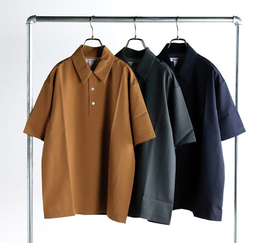 ポリエステル素材のさらりとした半袖シャツ。フロントボタンを上まで留めていただくとポロシャツのシルエット。しっかりと開けていただくと開襟シャツの姿に。アイデアとスポーツ素材ミックスの新しいシャツ。