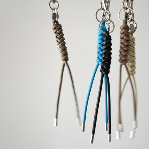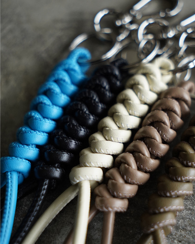 アウトドアやミリタリー由来の“スネークノット”編みをベースに、丸紐レザーを丁寧に編み上げることで、ラフな中に繊細さを感じさせる仕上がりに。程よいボリュームがありながらも主張しすぎず、バッグやベルトループに自然に馴染みます。