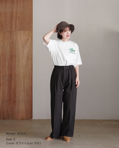 フロントにはさりげないワニロゴ、背面には大胆なブランドロゴを配し、シンプルな装いにも映える存在感のある一枚に仕上げられています。