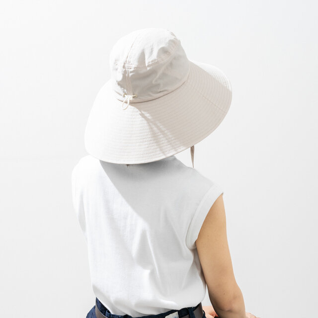 今回つばが広くなりました。前は約97mm、後ろは約140mm。顔まわりから首の後ろまでしっかり覆い、強い日差しから守ってくれます。UVカット率は99%以上。さらに、つば部分の高い遮熱効果により体感温度はマイナス10度の涼しさを実現。日差しの強い日でも、この帽子があれば日傘いらず。両手が自由になるので自転車に乗れますし、お買い物、散歩の時間にも気軽に取り入れられます。
