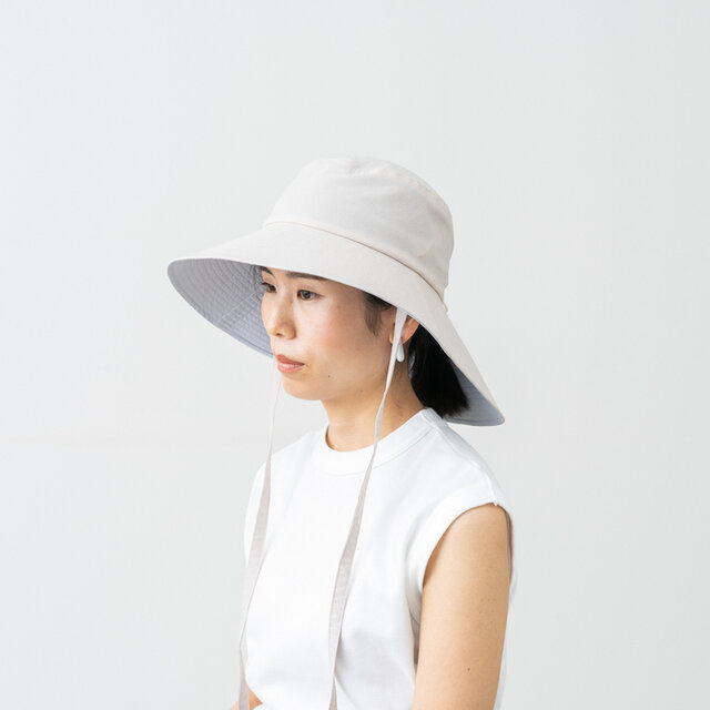 取り外し可能な紐付きで、風の強い日や自転車に乗るときも安心。使わないときは簡単に外せるので、すっきりとした印象でかぶれます。頭や耳に干渉しにくい設計にしました。