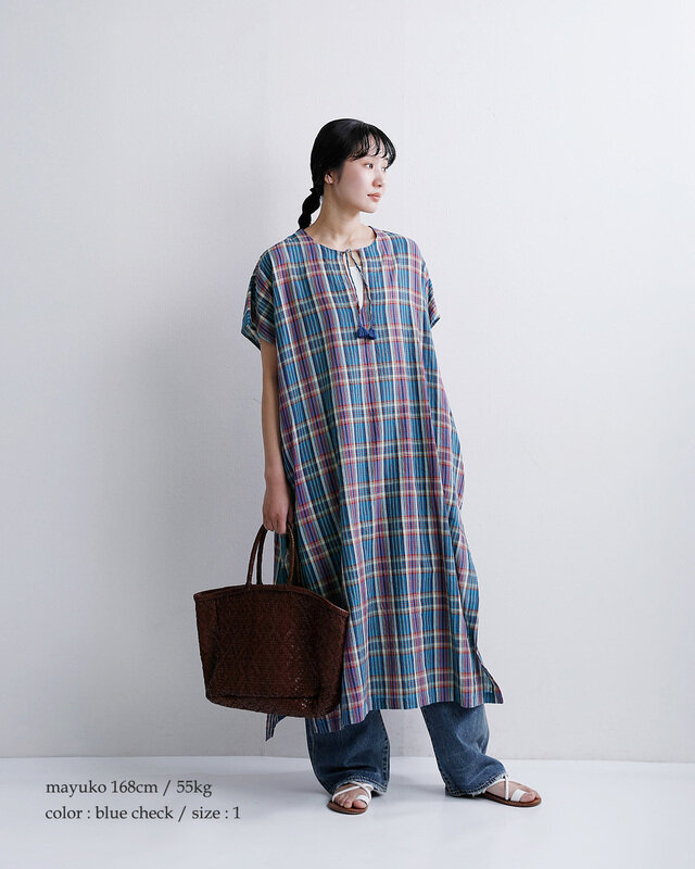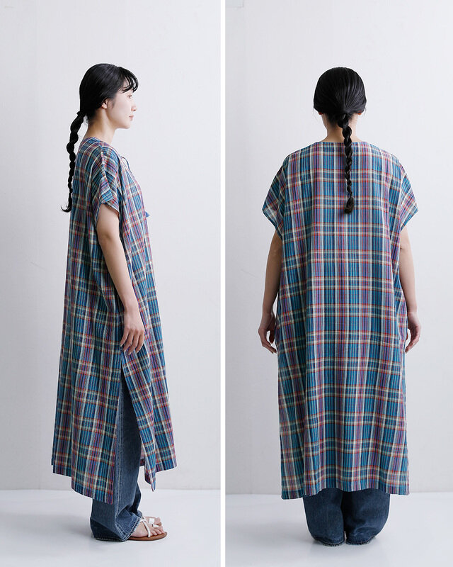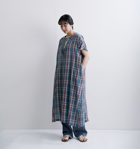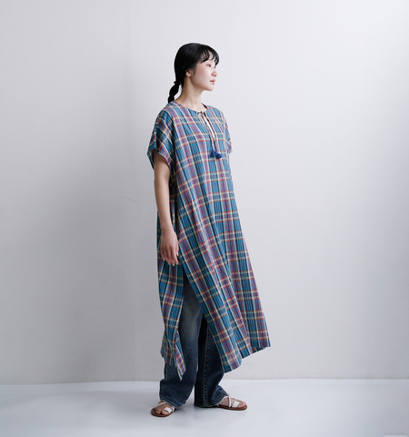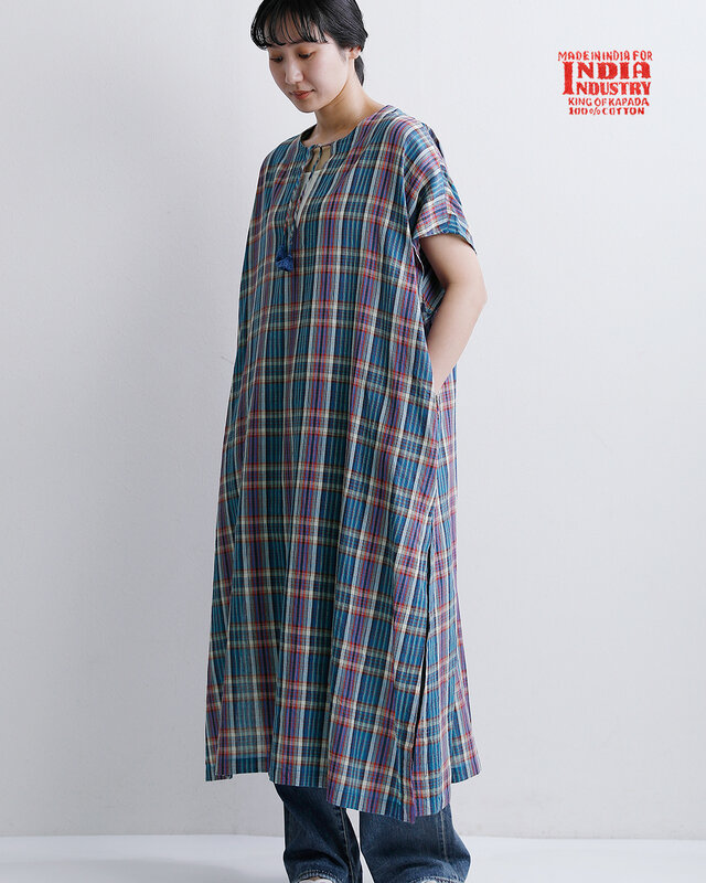 INDIA INDUSTRY|コットン マドラスチェック カフタン ワンピース nd-g0123mcb