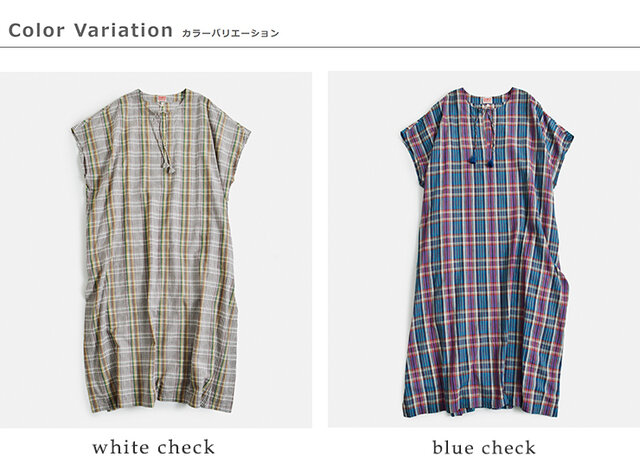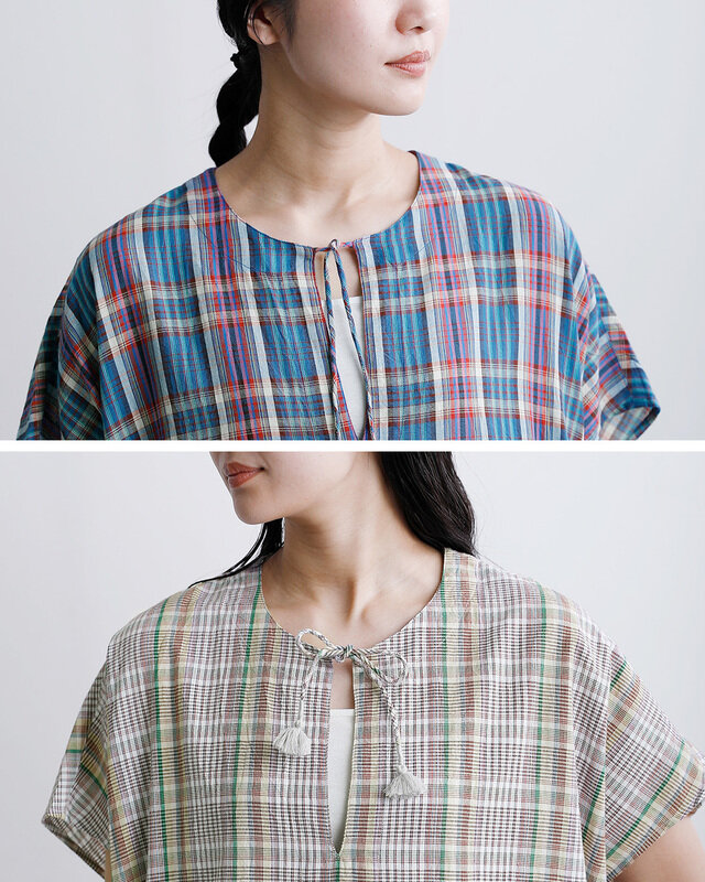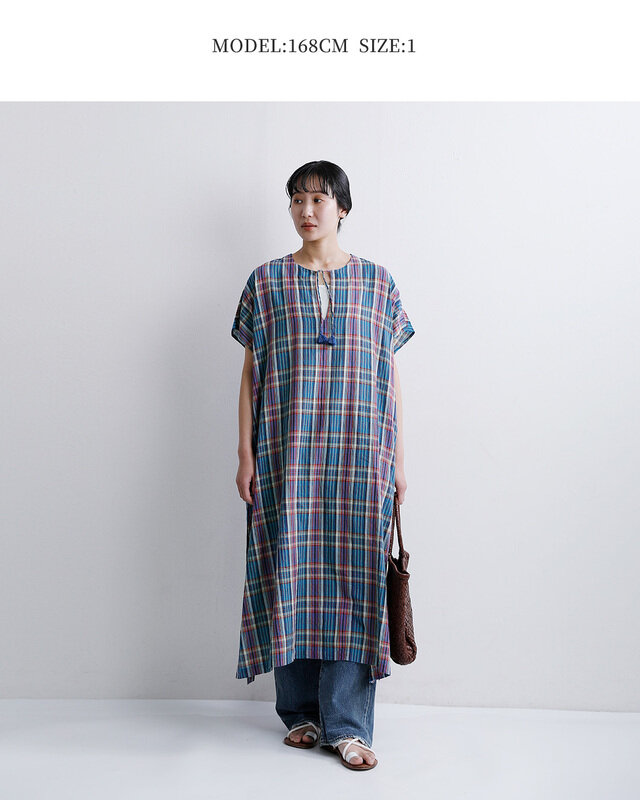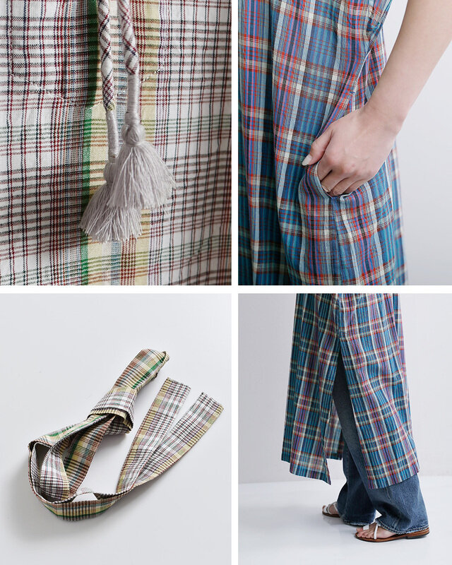 インド南部のマドラス地方で織られているマドラスチェック生地が華やかなカフタンドレス。薄手でさらりとしていて清涼感があり、夏場も涼しく着ていただけます。