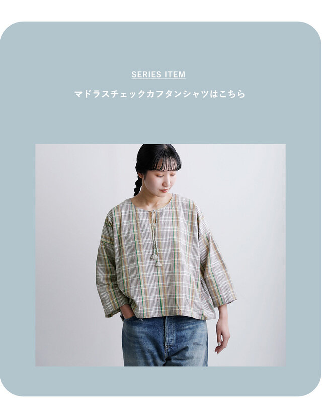インド独特の色合いが美しいマドラスチェック。インド南部のマドラス地方で織られており、手仕事の優しい風合いが感じられます。柔らかく、薄手でさらりとしていて、涼しく着ていただけます。