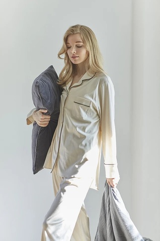 無染色パジャマ、KINARI SILKY ORGANIC COTTON PAJAMASをまとい、