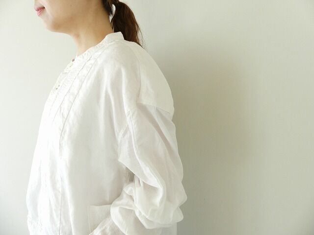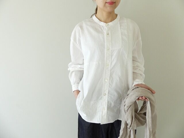 やわらかな白に、さりげない個性が重なるバンドカラーシャツ。