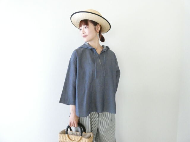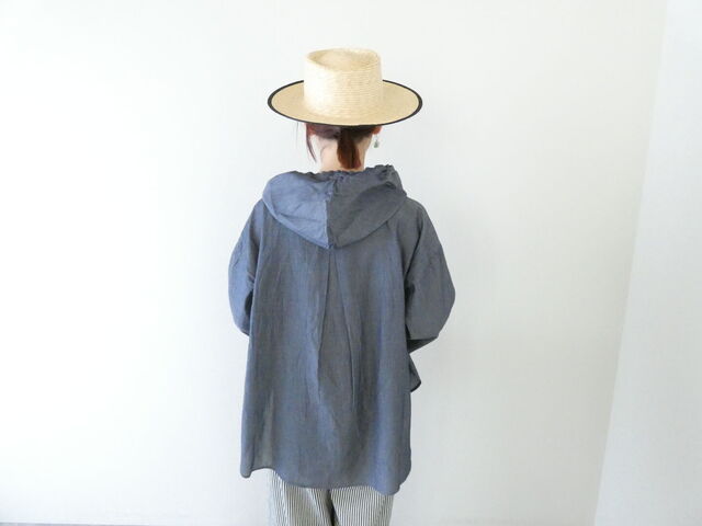 やわらかなインディゴの色合いが印象的な、軽やかなフード付きプルオーバーシャツ。