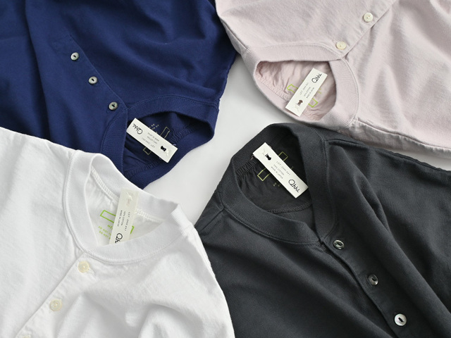 こちらは、シンプルなヘンリーネック長袖Tee。サイドに縫い目のない丸胴の生地を編み立ててオリジナルで製作しました。