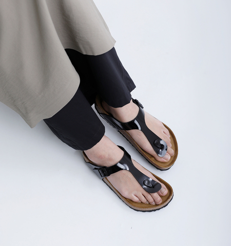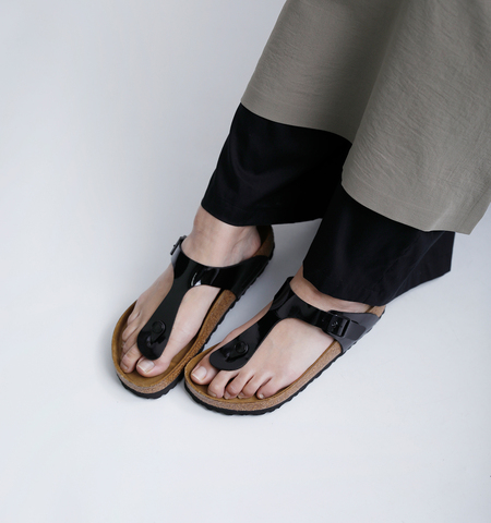BIRKENSTOCKの定番モデル「Gizeh(ギゼ)」に、艶やかな光沢が目を引くパテント加工を施しました。エナメルのような煌めきが、カジュアルになりがちなサンダルスタイルに上品さと都会的なムードをプラス。