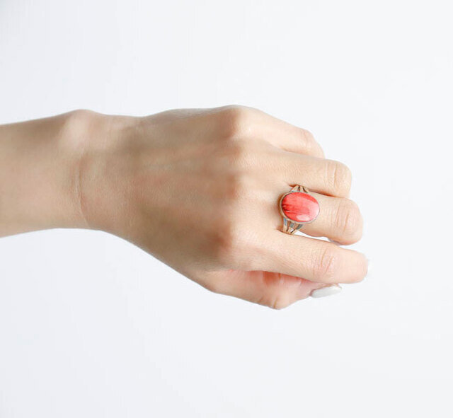 色鮮やかなピンクコーラルが装飾されたリングです。