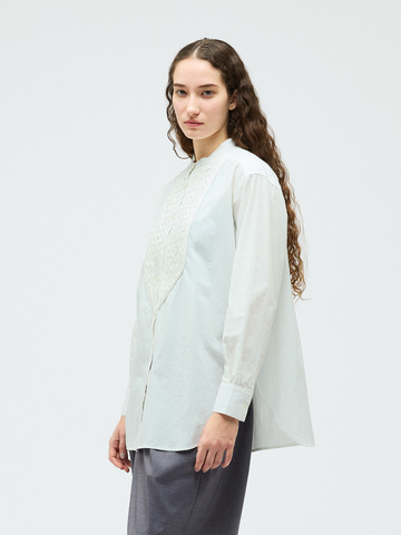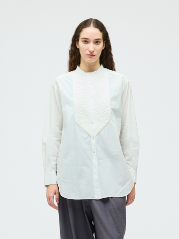 ハリのあるコットン生地にバイヤスにカットした共布を筒状にし、手仕事で斜めに編み込んだ特徴的な胸のデザインが魅力のブランディングクロスシャツです。