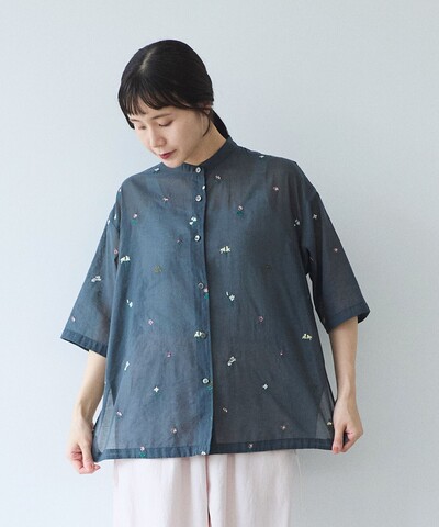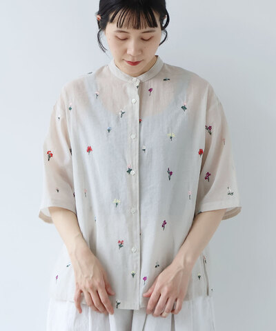 yuni|コットン/ナイロン sheer floral刺繍 half sleeves シャツ 1701BL013261