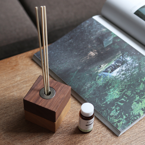 ブラックウォルナットとオーク材のコントラストが美しいディフューザーは上下がマグネット式になっており、フレグランスの交換もとても簡単。