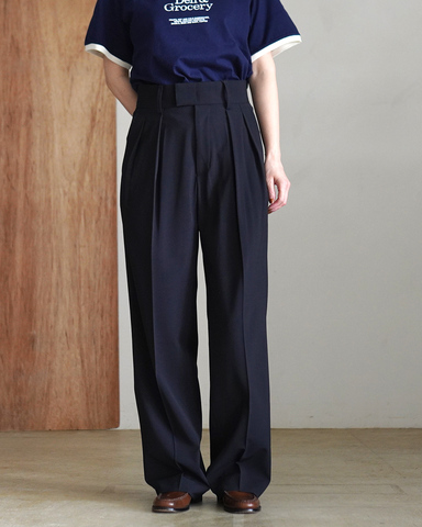 程よく深めのタックで腰まわりにゆとりを持たせつつ、美しいラインを描くシルエットは、Tシャツ1枚のシンプルなスタイリングにも映える一本。カジュアルからきれいめまで、着こなしの幅が広がります。