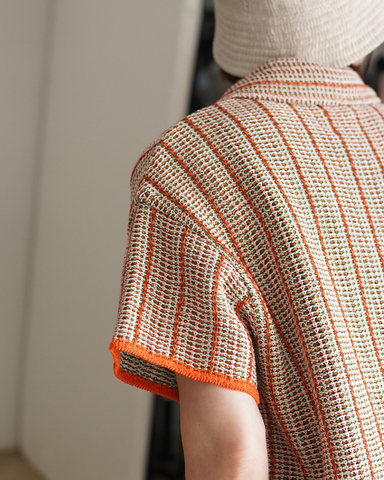 汗ばむ季節にも心地よく寄り添う、軽やかな羽織りとして活躍する一着。奥行きのある編地と透け感を掛け合わせたテキスタイルは、シンプルなスタイリングにニュアンスを添え、さりげなく個性を引き立てます。