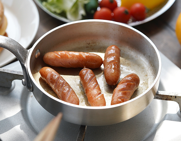 そして、ノーメイク仕様のフライパンは調理中の様子がわかりやすいのもポイントです。内側も明るい銀色なので、食材の焼き加減や火の通り具合、色の変化やソースの状態が一目瞭然、焦げ防止にもつながります。