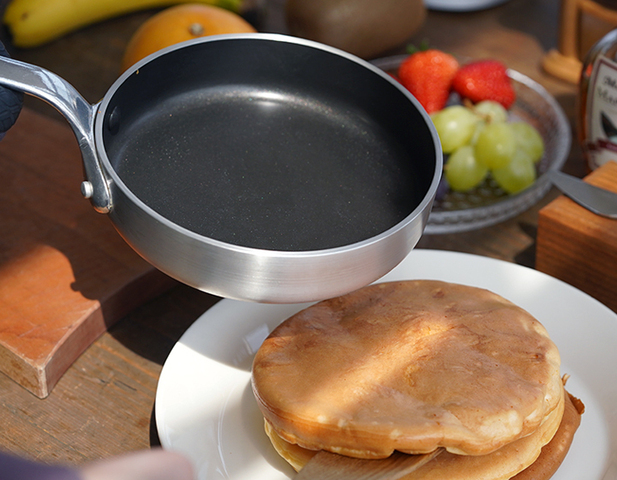 極厚のアルミ材は熱ムラが少なく、卵料理はふっくら美味しく、パンケーキもキレイな焼き色に仕上がります。