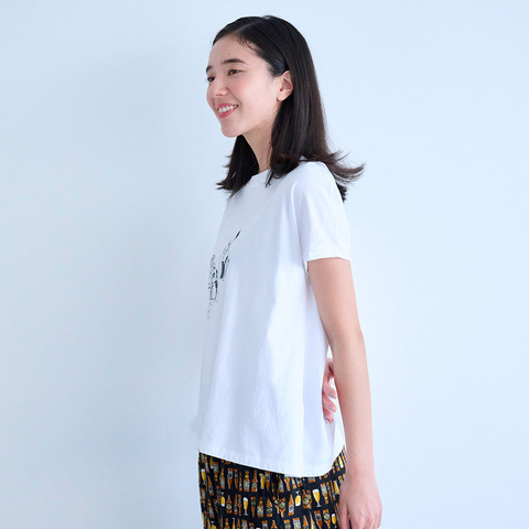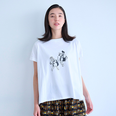 やわらかな天竺素材に、どこか懐かしい祭りのイラストをさりげなくのせた、ゆったりシルエットのTシャツです。