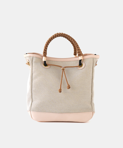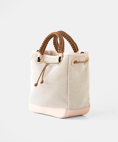 ハリのあるコットンキャンバスをベースに、パイピングやハトメの台座、底部分の切り替えにはヌメ革を贅沢に使用。