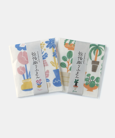 やさしい彩りのお花や植物をモチーフにした、mumokutekiオリジナルデザインの蚊帳織りふきんです。