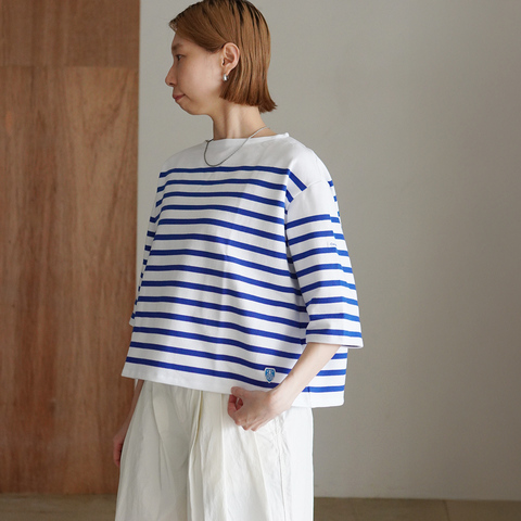 すっきりとしたボートネックとクロップド丈が印象的な五分袖バスクTシャツ。ゆとりのある身幅に対して袖幅をやや細めに設計し、ラフさと上品さをバランスよく仕上げています。