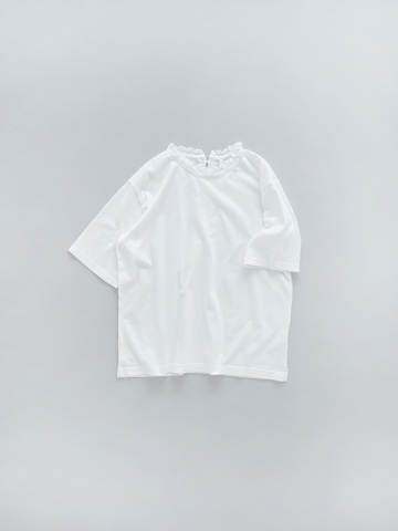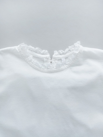 首元にはシャツ地のフリルをあしらい、コーディネートのさりげないアクセントに。細やかなタックで甘くなりすぎず、着やすいバランスです。
