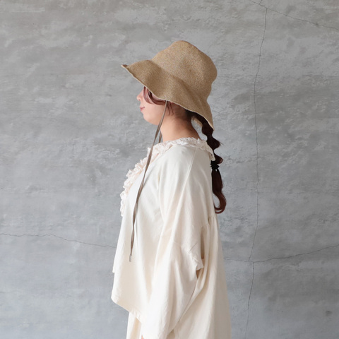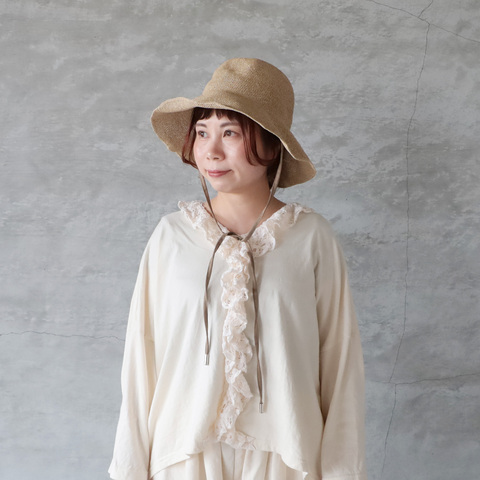 広めのツバが日差しをしっかりと遮りつつ、顔まわりをやさしく包み込み、女性らしい柔らかな印象に。