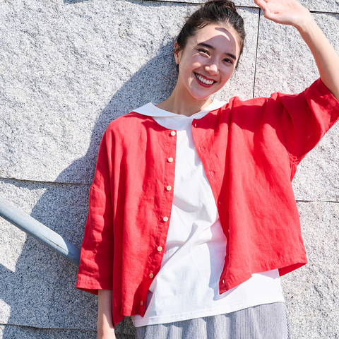 上質なフレンチリネンならではの、やわらかな風合いと自然な色合いです。汗ばむ季節も快適に着用できます。
