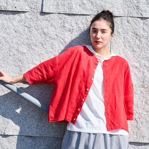 ナチュラルな風合いのボタンが、リネンのやさしい表情にさりげないアクセントを添えます。