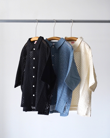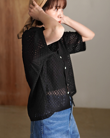 涼やかな透け感が印象的な、総レース仕立ての半袖シャツ。細やかな小花柄が広がる生地は、甘さを抑えたヴィンテージライクな表情で、大人の装いにも自然に馴染みます。