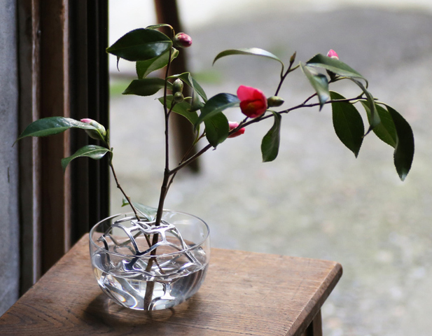 花瓶の上にセットすると…花留めの役割にも。枝ものや、葉っぱが少なく位置が決まりにくいお花も、固定しやすくなります。ランダムに曲げたKAGOが自然な“動き”をつくってくれる。